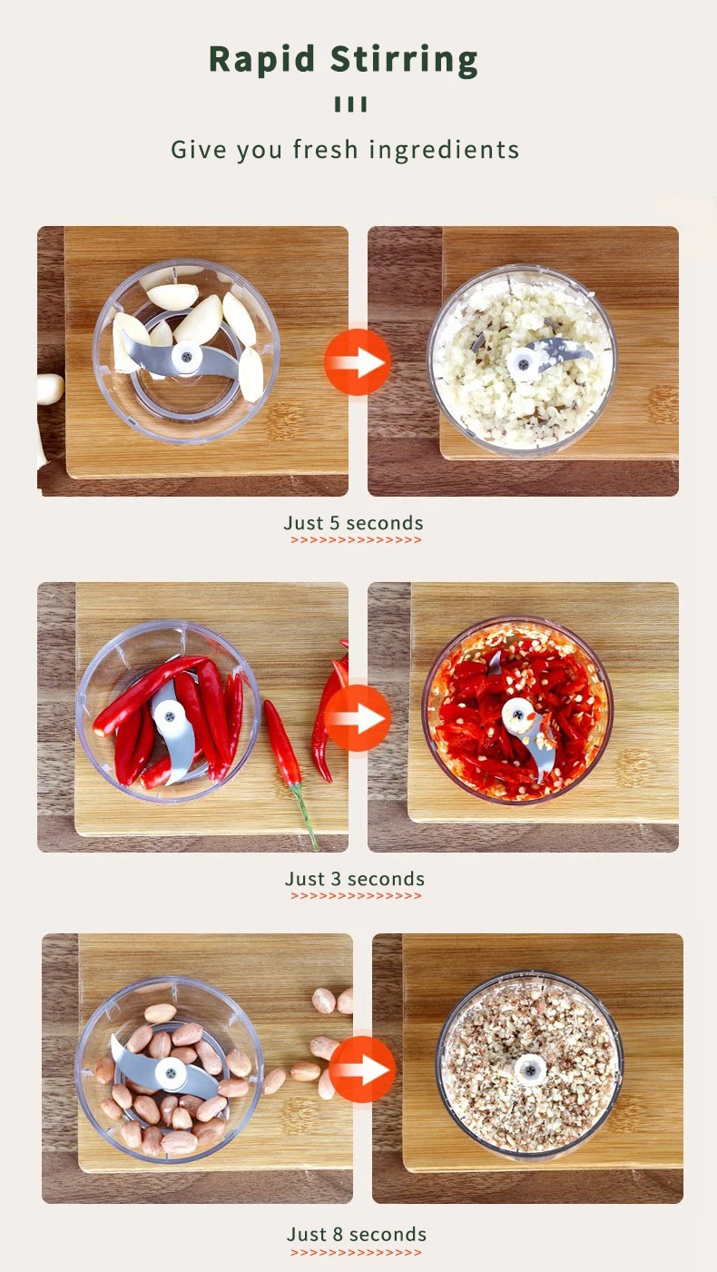 4. Hachage rapide: la lame tranchante du hachoir à ail peut hacher rapidement l’ail, les épices, les noix, les légumes, la viande, les glaçons, etc. Il convient très bien aux petits aliments